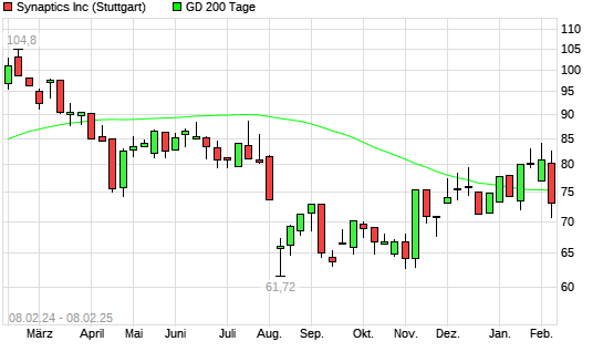 Mit dem Anstieg auf 75,00 EUR hat die Synaptics-Aktie am 07.02.2025 die 200-Tage-Linie nach oben gekreuzt.