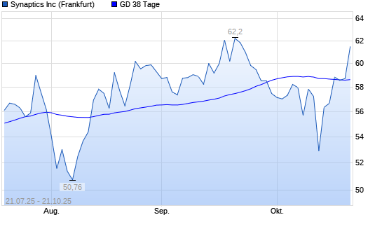 Mit dem Anstieg auf 58,72 EUR hat die Synaptics-Aktie am 20.10.2025 die 38-Tage-Linie nach oben gekreuzt.