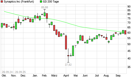 Mit dem Rücksetzer auf 59,48 EUR hat die Synaptics-Aktie am 25.09.2025 die 200-Tage-Linie nach unten gekreuzt.