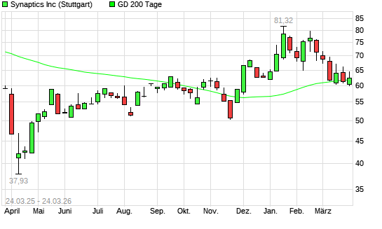 Mit dem Rücksetzer auf 60,20 EUR hat die Synaptics-Aktie am 23.03.2026 die 200-Tage-Linie nach unten gekreuzt.