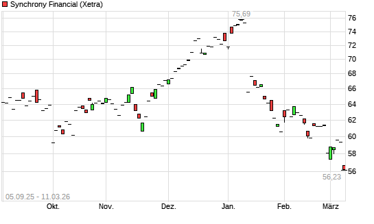 Mit dem Rücksetzer auf 56,23 EUR hat die Synchrony Financial-Aktie (ISIN US87165B1035) am 10.03.2026 ein neues 6-Monats-Tief erreicht und damit den Kurs vom 09.03.2026 eingestellt.