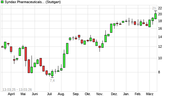 Mit dem Anstieg auf 20,80 EUR hat die Syndax Pharmaceuticals-Aktie (ISIN US87164F1057) am 12.03.2026 ein neues 12-Monats-Hoch erreicht und damit den Kurs vom 11.03.2026 eingestellt.