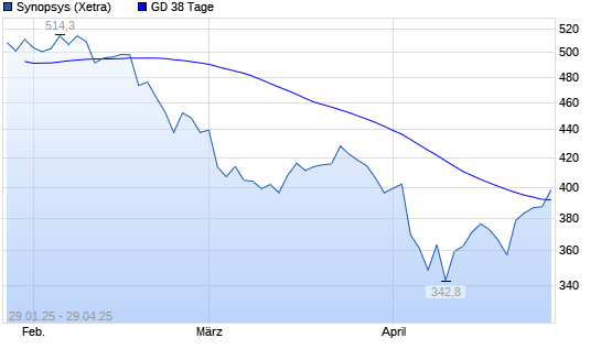 Mit dem Anstieg auf 391,75 EUR hat die Synopsys-Aktie am 28.04.2025 die 38-Tage-Linie nach oben gekreuzt.