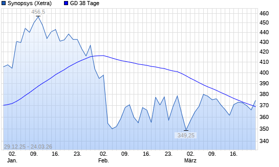 Mit dem Anstieg auf 377,25 EUR hat die Synopsys-Aktie am 23.03.2026 die 38-Tage-Linie nach oben gekreuzt.