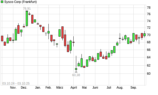 Mit dem Anstieg auf 70,99 EUR hat die Sysco-Aktie (ISIN US8718291078) am 02.10.2025 ein neues 6-Monats-Hoch erreicht und damit den Kurs vom 29.09.2025 eingestellt.