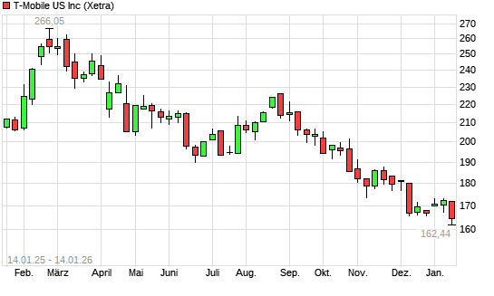 Mit dem Rücksetzer auf 162,20 EUR hat die T-Mobile US-Aktie (ISIN US8725901040) am 13.01.2026 ein neues 12-Monats-Tief erreicht und damit den Kurs vom 11.12.2025 eingestellt.