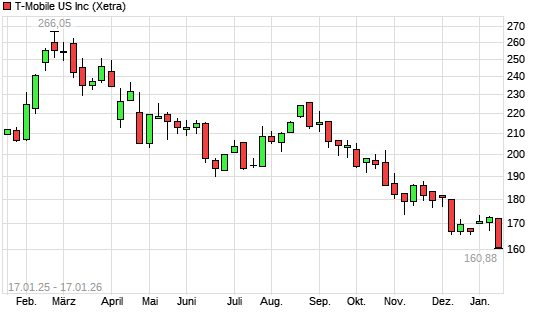 Mit dem Rücksetzer auf 161,08 EUR hat die T-Mobile US-Aktie (ISIN US8725901040) am 16.01.2026 ein neues 12-Monats-Tief erreicht und damit den Kurs vom 14.01.2026 eingestellt.