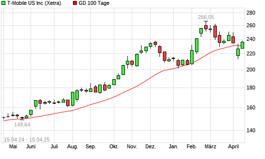 Mit dem Anstieg auf 232,25 EUR hat die T-Mobile US-Aktie am 14.04.2025 die 100-Tage-Linie nach oben gekreuzt.
