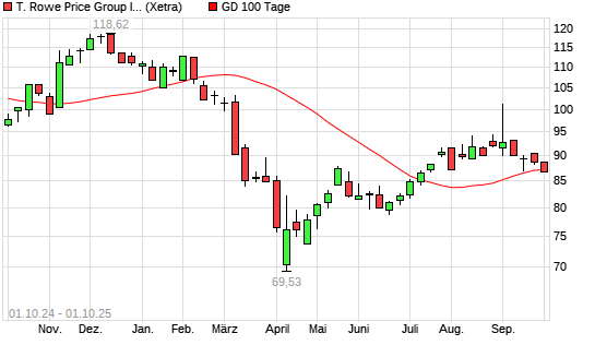 Mit dem Rücksetzer auf 86,76 EUR hat die T. Rowe Price Group-Aktie am 30.09.2025 die 100-Tage-Linie nach unten gekreuzt.