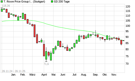 Mit dem Rücksetzer auf 86,83 EUR hat die T. Rowe Price Group-Aktie am 25.11.2025 die 200-Tage-Linie nach unten gekreuzt.