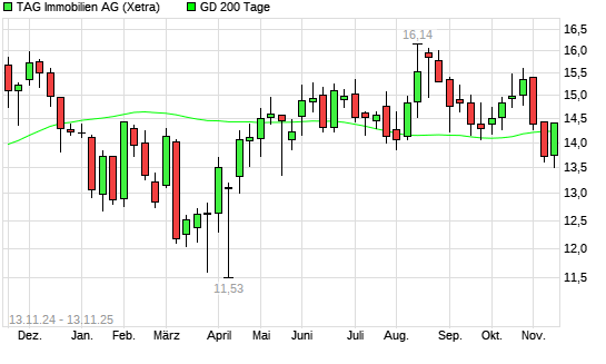 Mit dem Anstieg auf 14,20 EUR hat die TAG Immobilien-Aktie am 12.11.2025 die 200-Tage-Linie nach oben gekreuzt.