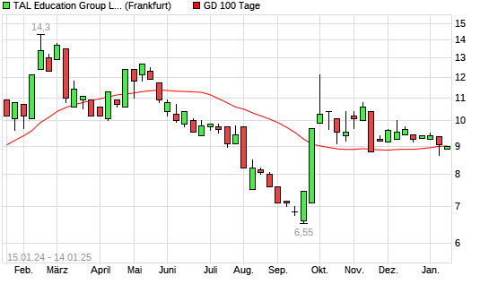 Mit dem Rücksetzer auf 8,85 EUR hat die TAL Education-Aktie am 13.01.2025 die 100-Tage-Linie nach unten gekreuzt.