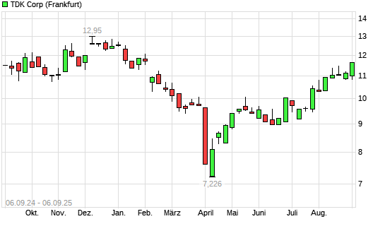 Mit dem Anstieg auf 11,64 EUR hat die TDK-Aktie (ISIN JP3538800008) am 05.09.2025 ein neues 6-Monats-Hoch erreicht und damit den Kurs vom 19.08.2025 eingestellt.