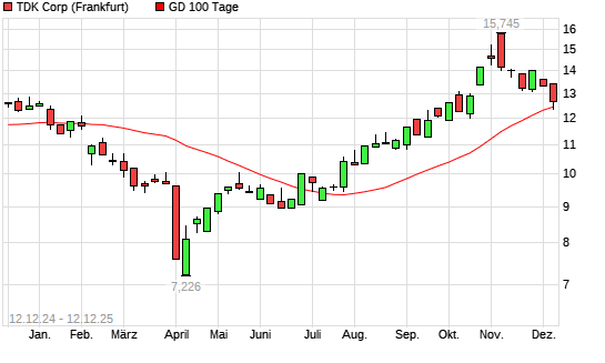 Mit dem Rücksetzer auf 12,36 EUR hat die TDK-Aktie am 11.12.2025 die 100-Tage-Linie nach unten gekreuzt.Die TDK-Aktie befindet sich seit dem 05.08.2025 im langfristigen ...weiterlesen