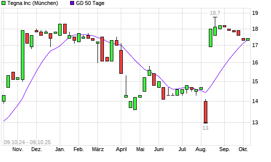 Mit dem Anstieg auf 17,40 EUR hat die TEGNA-Aktie am 08.10.2025 die 50-Tage-Linie nach oben gekreuzt.