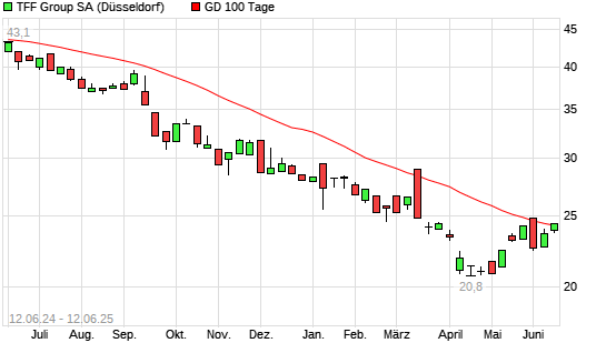 Mit dem Anstieg auf 24,20 EUR hat die TFF Group-Aktie am 11.06.2025 die 100-Tage-Linie nach oben gekreuzt.