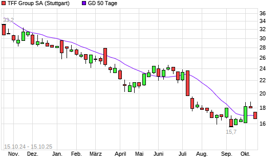 Mit dem Rücksetzer auf 16,85 EUR hat die TFF Group-Aktie am 14.10.2025 die 50-Tage-Linie nach unten gekreuzt.