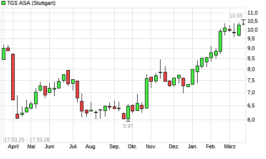 Mit dem Anstieg auf 10,31 EUR hat die TGS NOPEC Geophysical-Aktie (ISIN NO0003078800) am 16.03.2026 ein neues 12-Monats-Hoch erreicht und damit den Kurs vom 19.02.2026 eingestellt.