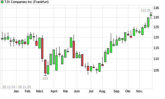 Mit dem Anstieg auf 131,88 EUR hat die TJX Companies-Aktie (ISIN US8725401090) am 25.11.2025 ein neues All-Time-High erreicht und damit den Kurs vom 24.11.2025 eingestellt.