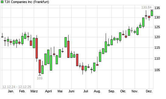 Mit dem Anstieg auf 133,84 EUR hat die TJX Companies-Aktie (ISIN US8725401090) am 11.12.2025 ein neues All-Time-High erreicht und damit den Kurs vom 10.12.2025 eingestellt.