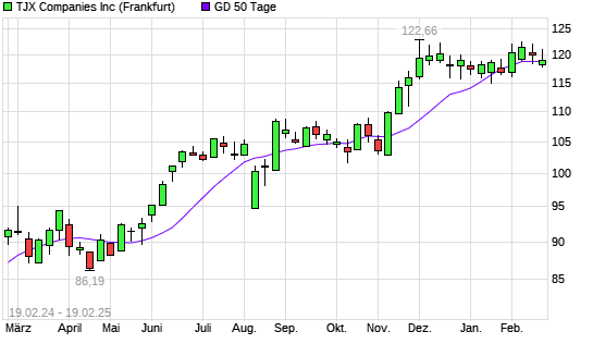 Mit dem Rücksetzer auf 118,56 EUR hat die TJX Companies-Aktie am 18.02.2025 die 50-Tage-Linie nach unten gekreuzt.