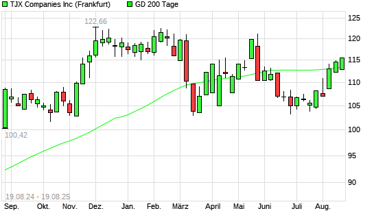 Mit dem Rücksetzer auf 112,90 EUR hat die TJX Companies-Aktie am 18.08.2025 die 200-Tage-Linie nach unten gekreuzt.Die TJX Companies-Aktie befand sich seit dem 11.08.2025 im langfristigen ...weiterlesen