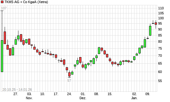 Mit dem Anstieg auf 95,55 EUR hat die TKMS-Aktie (ISIN DE000TKMS001) am 13.01.2026 ein neues All-Time-High erreicht und damit den Kurs vom 12.01.2026 eingestellt.
