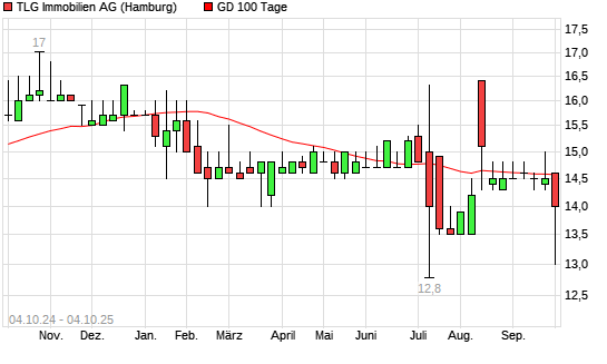 Mit dem Rücksetzer auf 14,00 EUR hat die TLG Immobilien-Aktie am 03.10.2025 die 100-Tage-Linie nach unten gekreuzt.