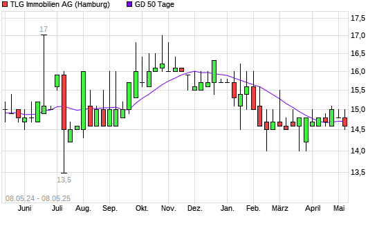 Mit dem Rücksetzer auf 14,60 EUR hat die TLG Immobilien-Aktie am 07.05.2025 die 50-Tage-Linie nach unten gekreuzt.