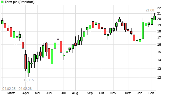 Mit dem Anstieg auf 21,08 EUR hat die TORM-Aktie (ISIN GB00BZ3CNK81) am 03.02.2026 ein neues 12-Monats-Hoch erreicht und damit den Kurs vom 14.01.2026 eingestellt.