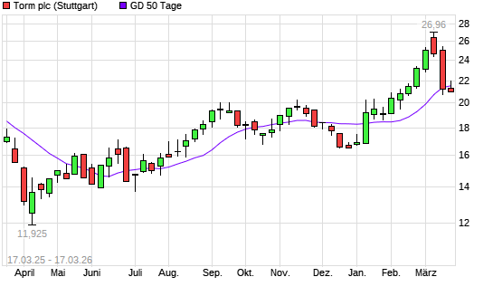 Mit dem Rücksetzer auf 21,41 EUR hat die TORM-Aktie am 16.03.2026 die 50-Tage-Linie nach unten gekreuzt.