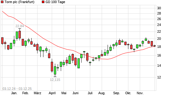 Mit dem Rücksetzer auf 17,98 EUR hat die TORM-Aktie am 02.12.2025 die 100-Tage-Linie nach unten gekreuzt.Die TORM-Aktie befindet sich seit dem 18.08.2025 im langfristigen Aufwärtstrend ...weiterlesen