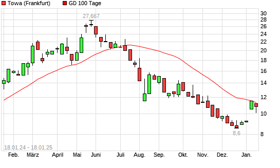 Mit dem Rücksetzer auf 10,80 EUR hat die TOWA-Aktie am 17.01.2025 die 100-Tage-Linie nach unten gekreuzt.