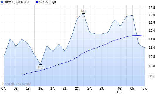Mit dem Rücksetzer auf 11,20 EUR hat die TOWA-Aktie am 06.02.2025 die 20-Tage-Linie nach unten gekreuzt.