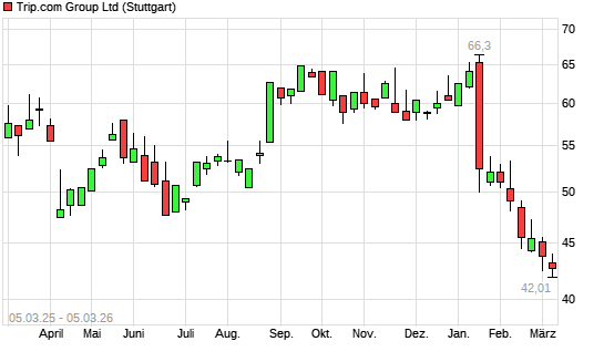 Mit dem Rücksetzer auf 42,50 EUR hat die TRIP.COM GROUP-Aktie (ISIN KYG9066F1019) am 04.03.2026 ein neues 12-Monats-Tief erreicht und damit den Kurs vom 03.03.2026 eingestellt.