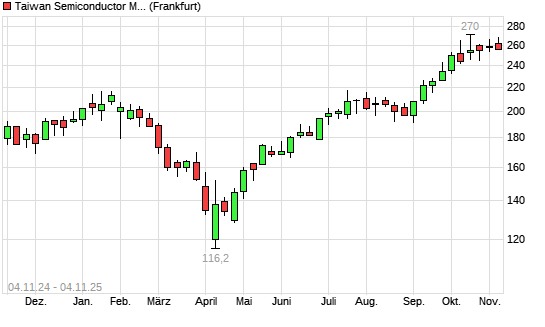 Mit dem Anstieg auf 265,00 EUR hat die TSMC-Aktie (ISIN US8740391003) am 03.11.2025 ein neues All-Time-High erreicht und damit den Kurs vom 13.10.2025 eingestellt.
