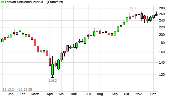 Mit dem Anstieg auf 267,50 EUR hat die TSMC-Aktie (ISIN US8740391003) am 10.12.2025 ein neues All-Time-High erreicht und damit den Kurs vom 03.11.2025 eingestellt.