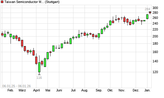 Mit dem Anstieg auf 274,00 EUR hat die TSMC-Aktie (ISIN US8740391003) am 05.01.2026 ein neues All-Time-High erreicht und damit den Kurs vom 02.01.2026 eingestellt.