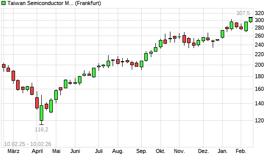 Mit dem Anstieg auf 298,50 EUR hat die TSMC-Aktie (ISIN US8740391003) am 09.02.2026 ein neues All-Time-High erreicht und damit den Kurs vom 15.01.2026 eingestellt.