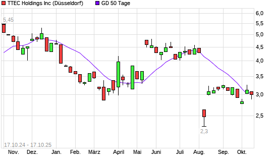 Mit dem Anstieg auf 3,10 EUR hat die TTEC Holdings-Aktie am 16.10.2025 die 50-Tage-Linie nach oben gekreuzt.
