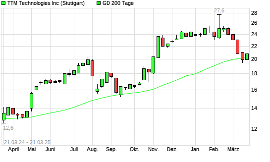 Mit dem Anstieg auf 20,40 EUR hat die TTM TECHNOLOGIES-Aktie am 20.03.2025 die 200-Tage-Linie nach oben gekreuzt.