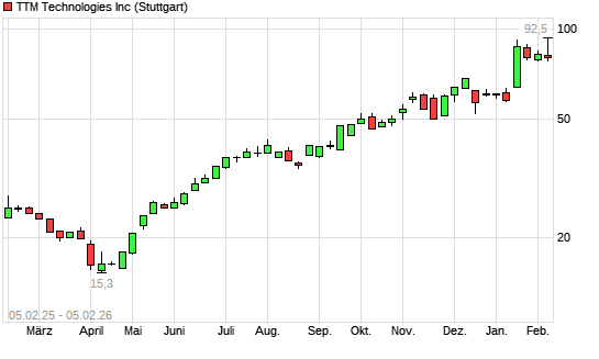 Mit dem Anstieg auf 92,00 EUR hat die TTM Technologies-Aktie (ISIN US87305R1095) am 04.02.2026 ein neues All-Time-High erreicht und damit den Kurs vom 15.01.2026 eingestellt.