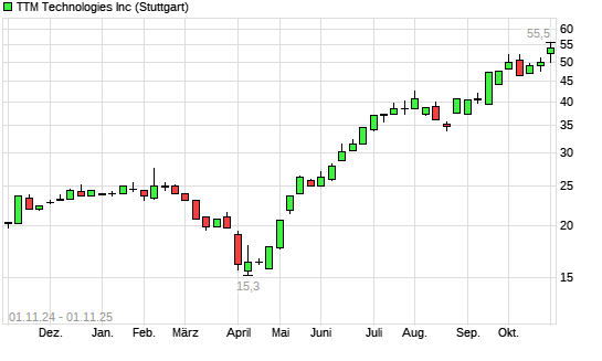 Mit dem Anstieg auf 57,50 EUR hat die TTM Technologies-Aktie (ISIN US87305R1095) am 31.10.2025 ein neues All-Time-High erreicht und damit den Kurs vom 30.10.2025 eingestellt.Die ...weiterlesen