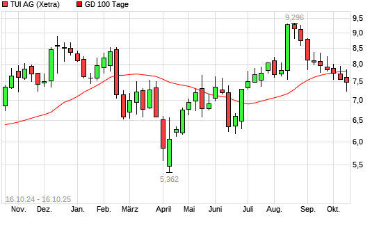 Mit dem Rücksetzer auf 7,60 EUR hat die TUI-Aktie am 15.10.2025 die 100-Tage-Linie nach unten gekreuzt.