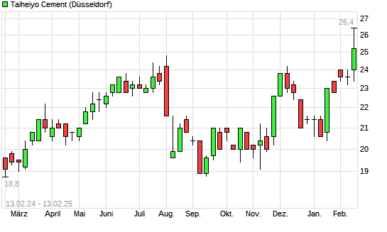 Mit dem Anstieg auf 26,40 EUR hat die Taiheiyo Cement-Aktie (ISIN JP3449020001) am 12.02.2025 ein neues 5-Jahres-Hoch erreicht und damit den Kurs vom 12.02.2020 eingestellt.