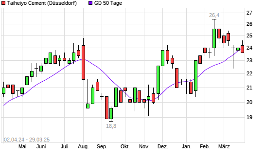Mit dem Rücksetzer auf 23,80 EUR hat die Taiheiyo Cement-Aktie am 28.03.2025 die 50-Tage-Linie nach unten gekreuzt.