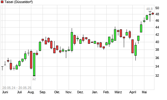 Mit dem Anstieg auf 48,60 EUR hat die Taisei-Aktie (ISIN JP3443600006) am 19.05.2025 ein neues 5-Jahres-Hoch erreicht und damit den Kurs vom 12.05.2025 eingestellt.