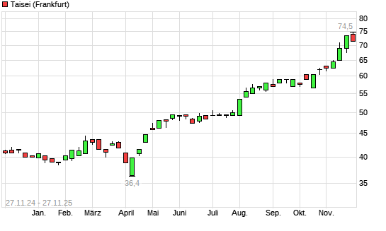 Mit dem Anstieg auf 74,50 EUR hat die Taisei-Aktie (ISIN JP3443600006) am 26.11.2025 ein neues All-Time-High erreicht und damit den Kurs vom 24.11.2025 eingestellt.