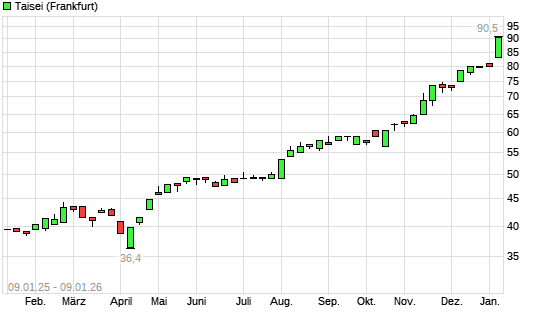 Mit dem Anstieg auf 86,00 EUR hat die Taisei-Aktie (ISIN JP3443600006) am 08.01.2026 ein neues All-Time-High erreicht und damit den Kurs vom 06.01.2026 eingestellt.