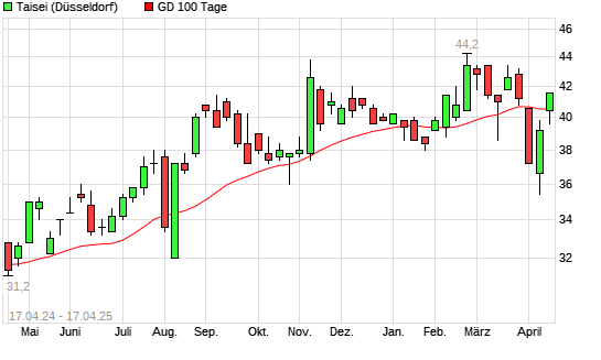 Mit dem Anstieg auf 41,40 EUR hat die Taisei-Aktie am 16.04.2025 die 100-Tage-Linie nach oben gekreuzt.